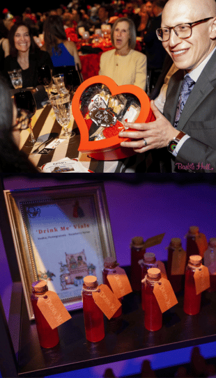 Highlights included a suspended DJ booth above a glowing Cheshire Cat, with the tail becoming part of the dance floor, and a dramatic transition into the Queen of Hearts Garden for dinner and the program. One of the most memorable moments came when the Queen of Hearts, emcee Taryn Daly, rewarded guests’ generosity with heart-shaped boxes of treats that floated down from the ceiling on custom rose-branded trays, creating an unforgettable interactive moment.